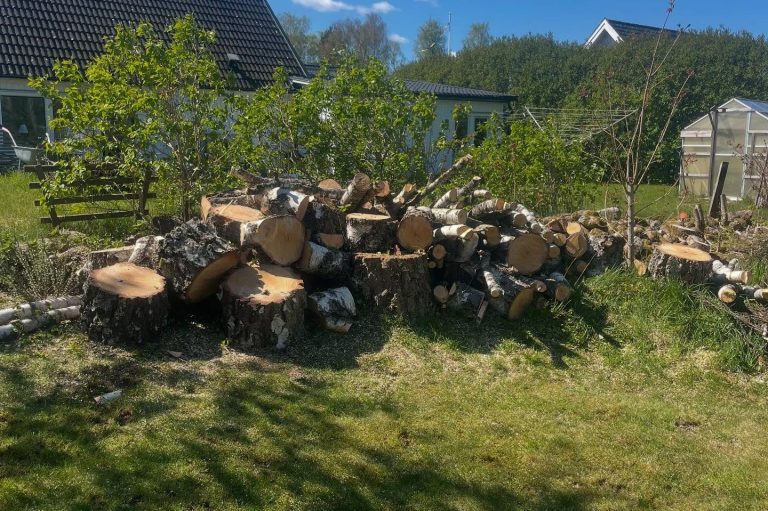 Efter trädfällning och beskärning kan det bli en hel del material kvar på backen. Vi erbjuder smidig bortforsling av grenar, stammar och trädgårdsavfall.
